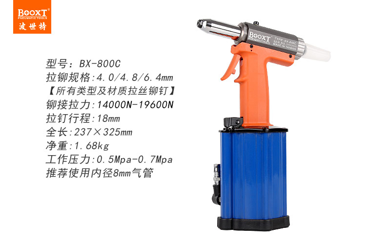 東莞市強勁五金工具有限公司提供臺灣BOOXT波世特品牌氣動工具,氣動拉釘槍BX-800C廠家直銷,首件享特價。咨詢熱線:4008301980