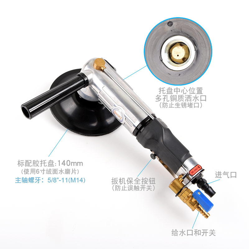 • 產品參數: 托盤尺寸:140mm(M14螺牙);使用磨片:140mm或150mm;轉速:11000rpm;長度:300mm;重量:2.0kg;功率:0.61hp;耗氣量:0.46立方米/分鐘;使用工作氣壓:0.63Mpa;推薦氣管內徑8mm;平時使用應多加氣動油保養