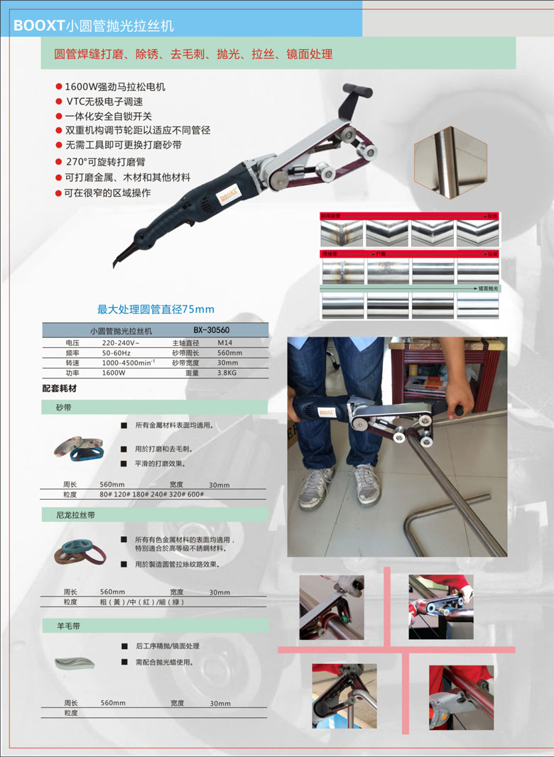 7)可以解決不銹鋼,鋁材等制品的劃痕,焊接后的打磨拋光與各種紋路的修復問題,處理的紋路修復效果,要配相應的耗材。