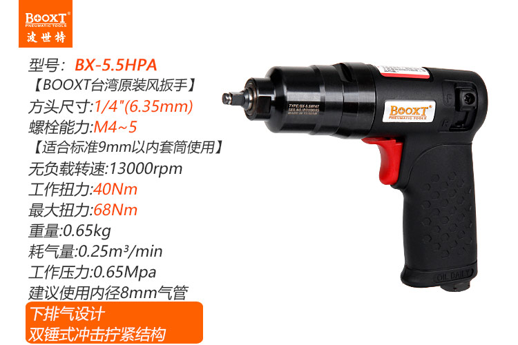 東莞市強勁五金工具有限公司提供臺灣BOOXT波世特品牌氣動工具,輕型風扳手BX-5.5HPA廠家直銷,首件享特價。咨詢熱線:4008301980