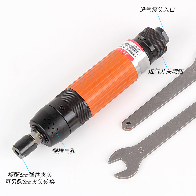 • 產品參數: 夾頭能力:M3,6 (標配M6) 馬達功率:0.32HP 空載轉速:24000rpm 工具能力:砂輪磨頭M25,旋轉銼刀M13 耗 氣 量:0.4m3/min 全 長:203mm 重 量 : 0.76kg 【旋鈕開關/超高同心度】