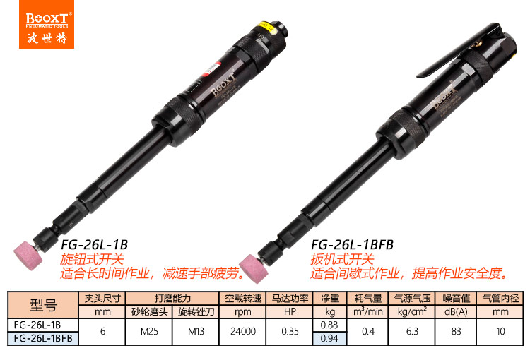 東莞市強(qiáng)勁五金工具有限公司提供臺灣BOOXT波世特品牌氣動工具,高精密氣動風(fēng)磨機(jī)FG-26L-1BFB廠家直銷,首件享特價。咨詢熱線:4008301980