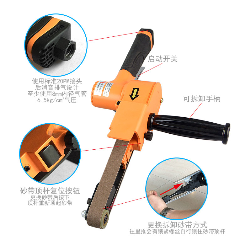 • 產品參數: 砂帶尺寸:20×520mm; 空載轉速:17000rpm; 工具長度:406mm; 工具重量:1.32kg; 馬達功率:0.5HP; 耗 氣 量:0.4立方米/分鐘; 使用工作氣壓:0.65Mpa; 推薦使用內徑8mm氣管; 平時使用應多加氣動油保養