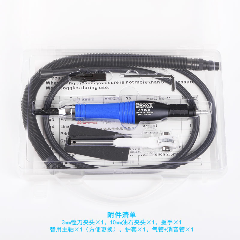 • 產品參數: 夾頭尺寸:3mm;行程:0.7mm;沖程數:35000bpm;長度:200mm;重量:0.2kg;耗氣量:0.21立方米/分鐘;推薦氣管尺寸:6.5mm